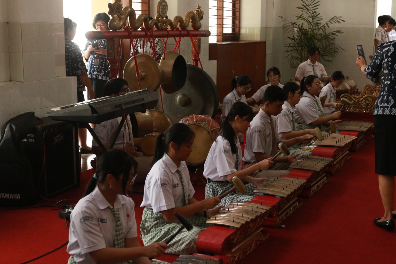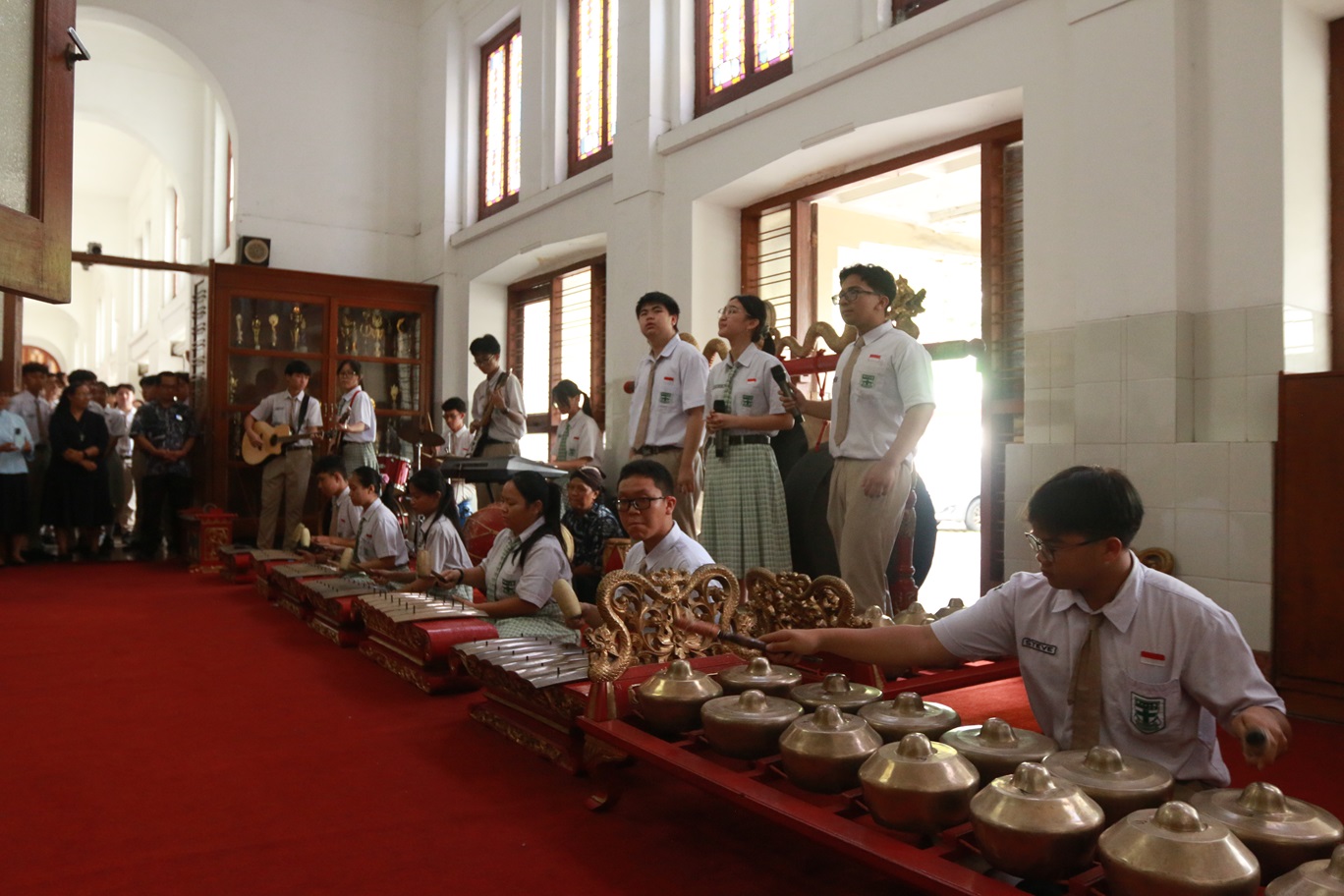 Sebagai bentuk penghormatan, para siswa menampilkan pertunjukan lagu tradisional diiringi musik gamelan di depan Ruang Ursula. Mereka bermain apik dan kompak di bawah bimbingan langsung Pak Pambuko selaku guru kesenian sekaligus pendamping. Penampilan grup karawitan ini tidak hanya menghibur, tetapi juga menyampaikan pesan tentang semangat, harapan, kekompakan, dan kebersamaan.