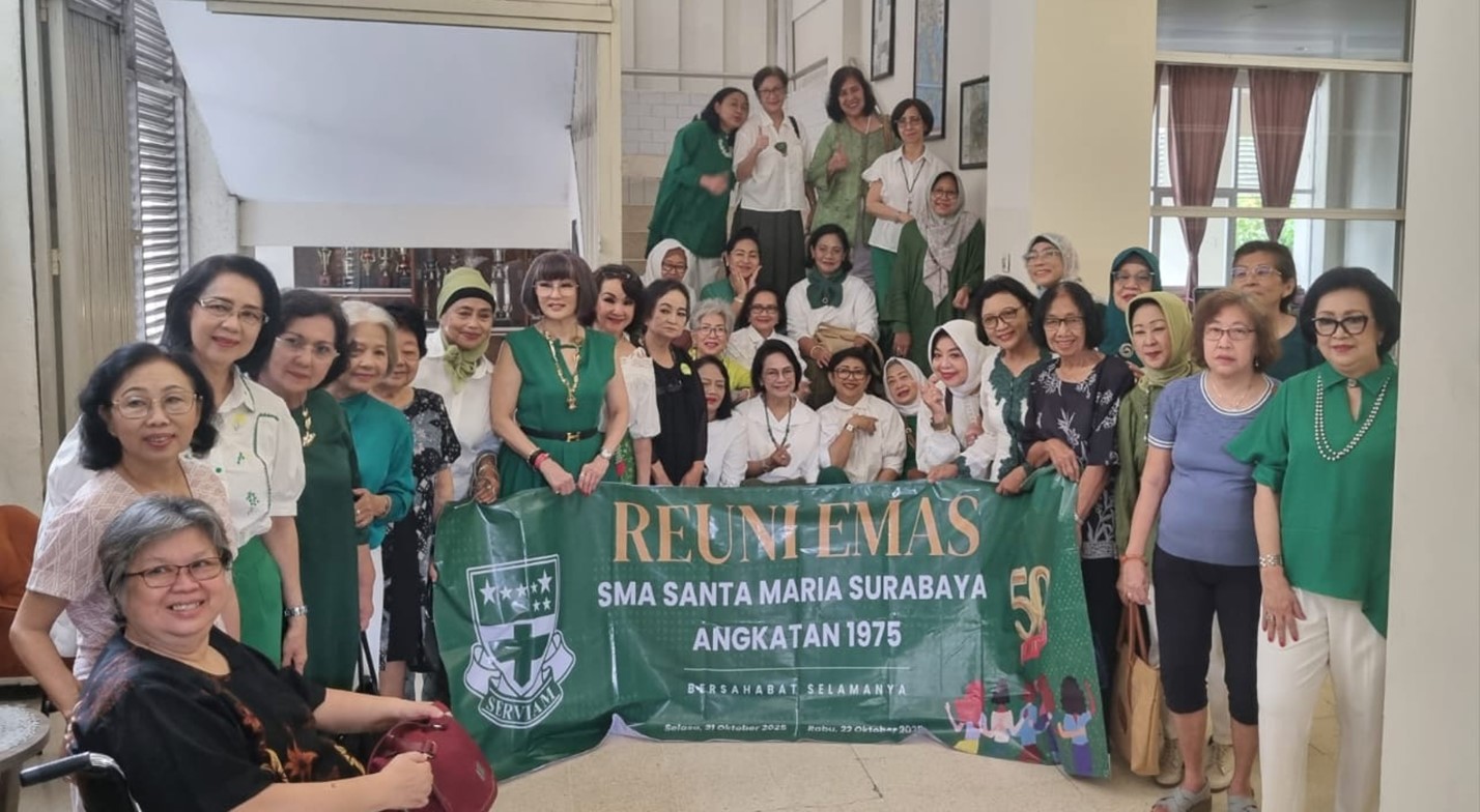 Surabaya, Kampus Ursulin — Sanmaris, suasana haru dan bahagia menyelimuti lingkungan SMA Santa Maria Surabaya, Selasa, 21 Oktober 2025, saat para alumni Angkatan 1975 kembali melangkahkan kaki ke almamater tercinta dalam acara “Reuni Emas SMA Santa Maria Surabaya Angkatan 1975” dengan tagline “Bersahabat Selamanya”. Setelah lima dekade menempuh perjalanan hidup masing-masing, para alumni kembali berkumpul untuk mengenang masa-masa indah semasa sekolah dan mempererat tali persaudaraan yang telah terjalin sejak remaja.